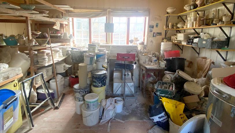 Det lyserøde hus emmer af at der bliver arbejdet med ler. Tekander, skåle, kopper og fade står udstillet i det meste af huset. Alle sirligt dekoreret – ikke ligefrem rustikt stentøj som hendes læremester. Nogle med små personer på – siddende, kyssende, liggende.